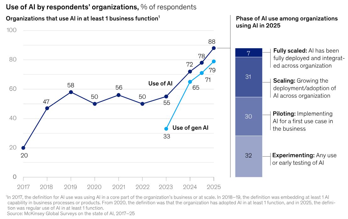 Однако суровая реальность такова: почти две трети компаний (63%) все еще находятся в фазе пилотного тестирования ИИ. Опрос McKinsey показывает, что, хотя ИИ используется во всех функциях, он редко внедряется в масштабах всего предприятия. В службе поддержки клиентов может быть чат-бот, а в цепочке поставок — модель прогнозирования, но они не связаны между собой, хрупки и далеки от масштабирования.