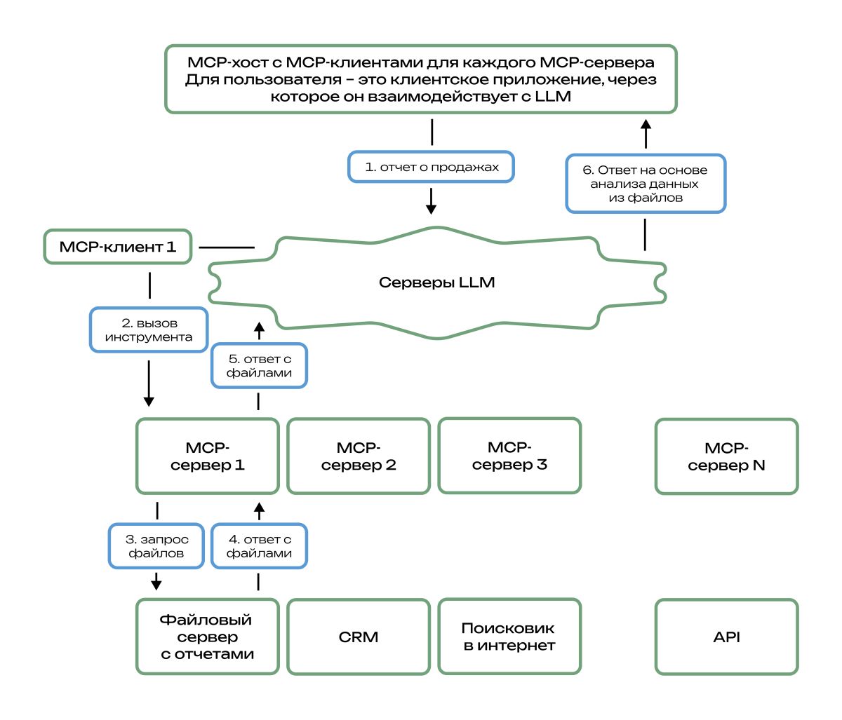 - MCP-сервер передает ответ через MCP-клиент в LLM.