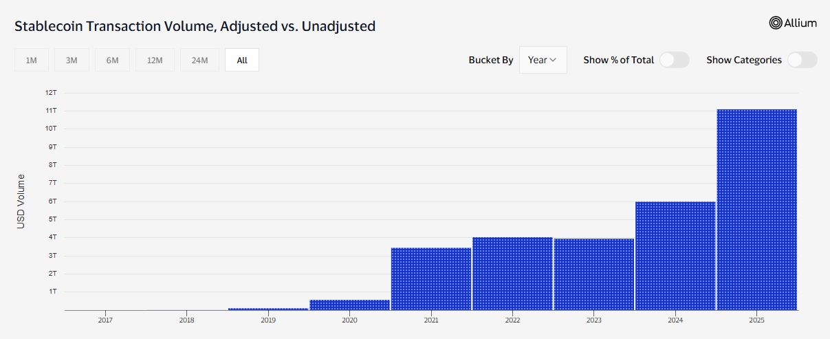 При этом, если верить статистике Visa, платежи в стейблкоинах на основе публичных блокчейнов стремительно растут, устанавливая с апреля новые и новые рекорды. В октябре их объем достиг рекордных 1,5 трлн. долл., в ноябре немного упал. Всего за неполный 2025 год объем платежей составил 11,1 трлн. долл., за весь