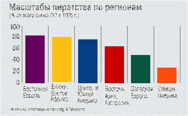 Вклад регионов. Ни для кого не является сюрпризом, что в области пиратского копирования ПО лидирует не соблюдающая экономического законодательства Восточная Европа. И скорого улучшения здесь не предвидится. Но отмечена положительная динамика в Азиатско-Тихоокеанском регионе. Его доля в общем количестве используемого пиратского ПО уменьшилась с 68% до 64%. В Японии доля пиратских программ упала с 66% в 1994 г. до 55% в 1995 г.