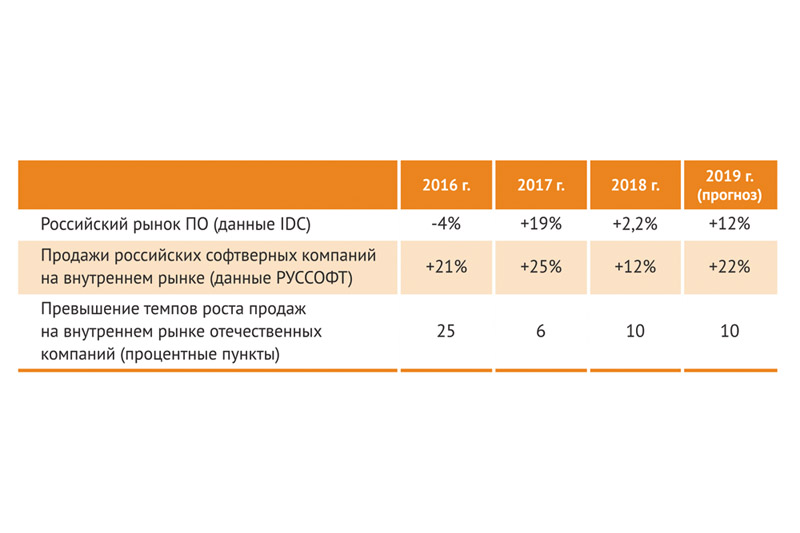Если сравнивать темпы роста рынка ПО и продаж российских компаний разработчиков ПО на внутреннем рынке, то в 2016 г. разница была огромной — 25 процентных пунктов (настолько быстрее рынка росли продажи на нем отечественных компаний в долларовом выражении), в 2017 г. эта разница сократилась до 6 процентных пунктов, а в 2018 г. — увеличилась примерно до 10. Примерно столько же должно получиться и по итогам текущего года: IDC прогнозирует рост российского рынка ПО на 12%, а ожидаемое увеличение продаж на внутреннем рынке отечественных софтверных компаний составляет примерно 22% (соответствующие расчеты РУССОФТ сделал на основе опроса разработчиков ПО).