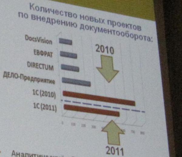 А вот еще фрагмент слайда с оценками 1С ситуации на рынке СЭД (за 2011 год данные за пять месяцев). Тут не включены внедрения решения у партнеров "1С" (как минимум несколько сот внедрений).