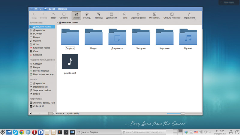 Используемая версия KDE — KDE 4.14.6. К сожалению, в ней встречаются некоторые ошибки. В частности, файловый менеджер Dolphin не позволяет добавлять точки входа привычным для пользователя способом — «перетаскивать» каталог в боковую панель. Для обхода этого недостатка следует дать команду открытия файла в любой KDE-программе и проделать все необходимые процедуры в открывшемся окне.