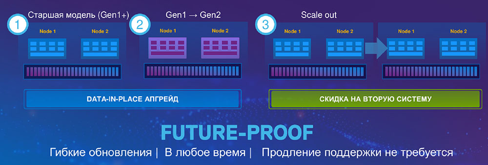 Помимо своей умной архитектуры и высокой производительности система PowerStore привлекательна ещё и опцией Anytime Upgrades, которую без преувеличения можно назвать самой гибкой в отрасли программой обновления контроллеров. Заказчики могут быть уверены, что при выходе следующего поколения контроллеров они безостановочно смогут заменить их на более производительные без дополнительных затрат на апгрейд при условии приобретения сервиса Anytime Upgrades. Как раз за счёт умной адаптируемой архитектуры этой системы обновления Anytime Upgrades позволяют избежать миграции и сохранить непрерывность бизнес-процессов.