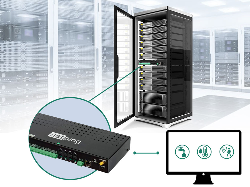 На дискретные входы контроллеров NetPing подключается кабель‑датчик протечки через адаптер WA875. Кабель укладывается под оборудованием по периметру серверной или вдоль трасс охлаждения. При контакте с водой контроллер моментально генерирует тревогу и при необходимости отключает питание оборудования через управляемую розетку или IP PDU.