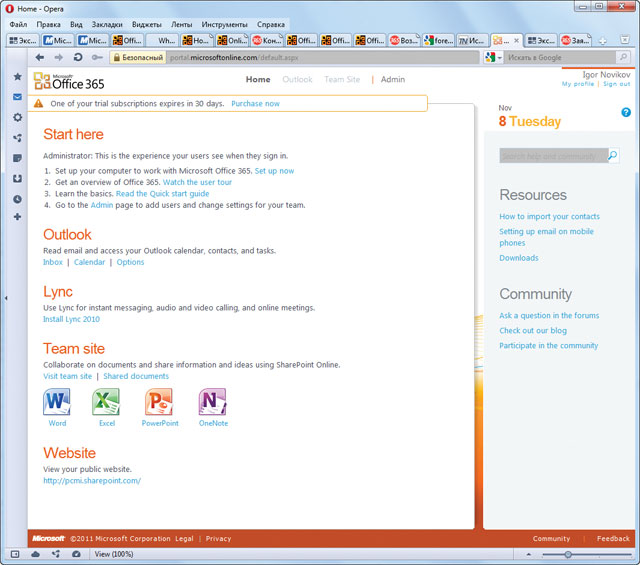 Начать практическое освоение возможностей Office 365 может любой пользователь, в том числе российский. Для этого Microsoft открыла сайт, размещенный по адресу office365.com, где любая компания может запросить триальную версию продукта. Работа с ним становится начальной ступенью, позволяющей компании бесплатно попробовать облачный сервис в работе, прежде чем принимать решение о приобретении подписки с ежемесячной абонентской платой.