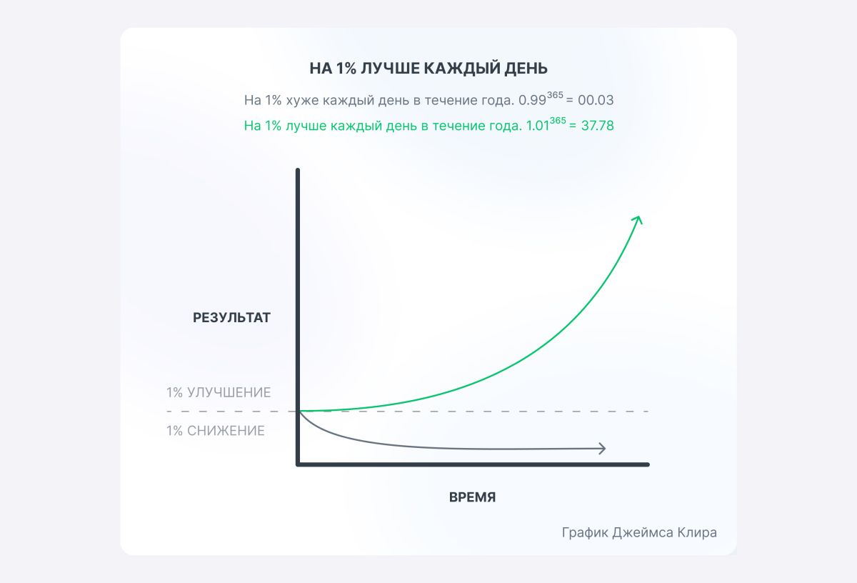 Если каждый день человек будет внедрять хотя бы 1% полезных изменений, то его результаты в течение года улучшатся в 37 раз. Но и наоборот это тоже работает. Привычки, которые мы выбираем сегодня, — это тот фундамент, на котором стоит наше будущее.