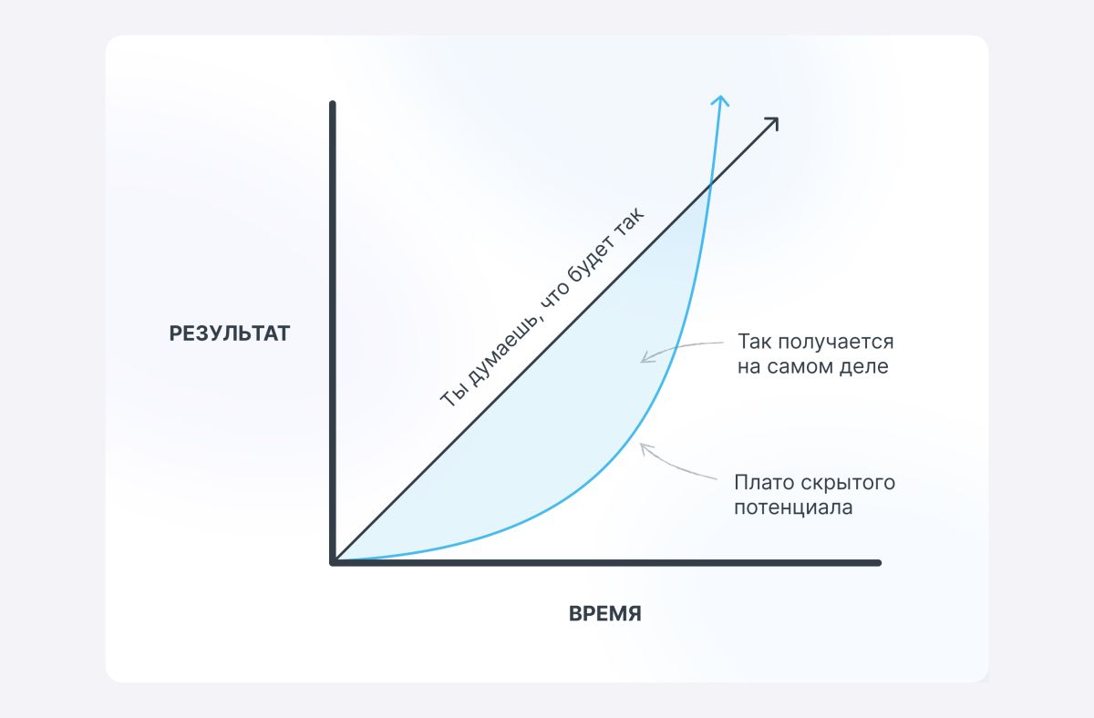 Прогресс при внедрении маленьких привычек не происходит линейно по возрастающей. Какое-то время ситуация находится на плато: вы прикладываете немало усилий в разных сферах, но при этом ничего не происходит. И только через время случается взрыв — тот самый результат, которого вы ждете.