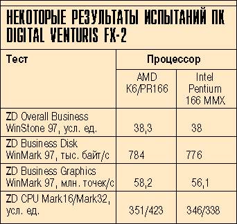 На тестах Ziff-Davis Labs (“пользовательский” тест Businnes WinStone 97, “синтетический” универсальный тест оценки производительности подсистем ПК WinBench 97; тестирование ПК проводилось в среде ОС Windows 95 OSR2.1 при объеме ОЗУ 32 Мб, разрешении дисплея 1024х768 точек при 256 цветах) ПК Digital Venturis FX-2 показали на большинстве подтестов результаты (см. таблицу), близкие к средним на сравнительных испытаниях ПК с процессорами Intel Pentium-200 MMX, проведенных Ziff-Davis Labs (см. PC Magazine/RE, № 4/97, с. 40 и Web-узел издательства Ziff-Davis: www.zdnet. com или www.zdnet.ru). На результаты тестов, несомненно, повлияло (в лучшую сторону) применение современных типов запоминающих устройств - системного ОЗУ типа SDRAM и видеоОЗУ типа SGRAM в видеоконтроллере. Как видно из таблицы результатов, на стандартных офисных приложениях Digital Venturis FX-2 с процессором AMD K6/PR166 несколько опережает “близнеца” с процессором Intel Pentium-166 MMX, особенно на тесте CPU Mark32.