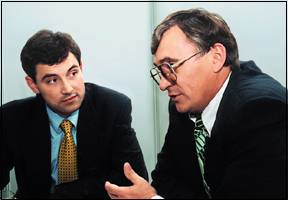 Александр Лещенко (справа) - Константину Кравченко: “Расходы АвтоВАЗа на информатизацию весьма незначительны - около 10 млн. долл. в год. Поделите эту сумму на число выпускаемых нами машин... Получится менее 15 долл. на автомобиль”