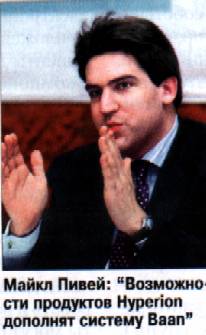 Помимо подведения годовых итогов у Baan был еще один повод для встречи с журналистами - представление своего партнера, фирмы Hyperion, сотрудничество с которой на мировой арене продолжается уже более года, а теперь начинается и в России. Приехавший на встречу директор по бизнесу в Восточной Европе этой компании Майкл Пивей пояснил, что Hyperion - поставщик финансовых и аналитических программ. Продукты фирмы можно разделить на три группы: Enterprise (стоимостью 175 тыс. долл.) - для эффективного финансового управления корпорациями, выполнения всех видов консолидации; Pillar (70 тыс. долл.) - для планирования и составления бюджета; средства OLAP (60 тыс. долл.) - для составления многомерных аналитических сводок в реальном времени (в этой категории Hyperion является ближайшим конкурентом Oracle OLAP). Их внедрение занимает от 5 до 100 дней, в зависимости от масштаба предприятия.