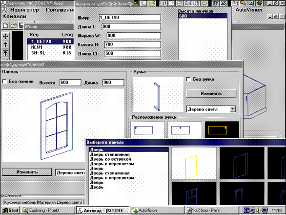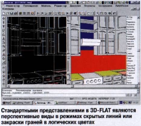В одной московской фирме при покупке кухонной мебели мне довелось наблюдать работу некой российской заказной программы. Она несложна и эффективна в использовании, но до уровня коммерческого продукта недотягивает. Библиотека элементов создана в виде внутренних блоков в файле прототипа чертежа AutoCAD и не имеет графического меню. Программа позволяет создавать планировку для помещений с проемами в стенах. Вставка блоков производится из командной строки AutoCAD. Визуализация ограничена изометрией со скрытыми невидимыми линиями. Спецификация посылается в Excel. Листок с расшифровкой имен блоков занимает на стене офиса фирмы почетное место. Эта программа допускает пополнение перечня блоков, что является огромным преимуществом, однако при столь скромном сервисе использование AutoCAD R14 и Excel 97 в сочетании с ПК на базе процессора не ниже 90 МГц Pentium, ОЗУ 32 Мб, необходимым объемом дискового пространства не менее 200 Мб кажется не вполне оправданным. Сам же факт появления подобного отечественного продукта радует.