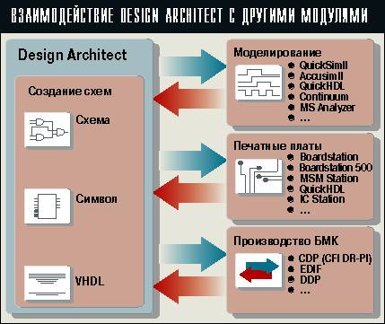 Design Architect представляет собой универсальный редактор схем, передаваемых затем на разработку печатных плат, программируемых логических матриц, интегральных схем или базовых матричных кристаллов. Его интуитивно понятный интерфейс имеет много возможностей для ускорения ввода графических объектов. Инструмент оперирует с иерархическими схемами, графическими символами и фрагментами схем, описанных на языке VHDL, и передает данные различным программам. К их числу относятся пакеты моделирования аналоговых и цифровых устройств, проектирования топологии многослойных печатных плат, включая гибридные платы, и многокристальные сборки и программы третьих фирм, в частности для разработки заказных и полузаказных интегральных схем с передачей данных о списках соединений в форматах CDP, EDIF и DDP. C помощью инструмента RF Gateway обеспечивается непосредственный интерфейс с программами ряда других фирм, в частности с пакетом HP EEsoft Series IV для разработки устройств СВЧ.