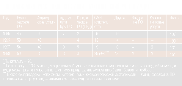 Традиционно встречал посетителей у входа огромный воздушный шар фирмы “1С”. Традиционно выставку сопровождали семинары, презентации, круглые столы и пресс-конференции. Уже практически устоялся, хотя и несколько возрос (как численно, так и “персонально”), состав участников. В этом году он увеличился в основном за счет издательств и СМИ (см. таблицу). Издательства представляли огромное разнообразие экономической и бухгалтерской литературы, а стенды некоторых изданий радовали глаз нетривиальным оформлением (“Финансовая газета” продемонстрировала в буквальном смысле музейные экземпляры прошлых лет выпуска - дореволюционные, военного времени, - позаимствованные для этой цели из библиотеки Министерства финансов).