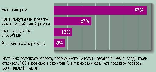 В исследовании компании Forrester Research сеть Интернет называется “четвертым каналом”, связывающим людей друг с другом (после личного общения, телефона и почты). Из общего объема электронной торговли в 1997 г. (8 млн. долл.) 3 млн. долл. (38%) пришлось на продажу товаров производителями, 2 млн. долл. - на реселлерские и дистрибьюторские операции с помощью Интернет, еще 2 млн. долл. дали операции по продажам через Сеть природного газа и нефти и, наконец, на 1 млн. долл. было продано различных услуг, включая распространение ПО.