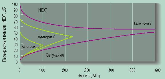 Решающее значение для работоспособности кабеля имеют две его характеристики: NEXT (перекрестные помехи на ближнем конце) и затухание. Из рисунка видно, что значения частот 100, 200 и 600 МГц являются критическими точками для кабелей классов D, E и F соответственно.