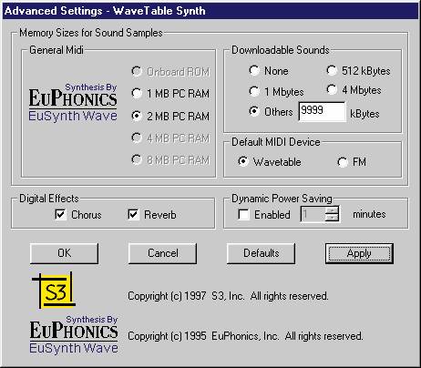 В плате S3 SonicVibes реализован новый MIDI-стандарт Downloadable Sounds (DLS) Level 1, допускающий хранение образцов звучания (сэмплов) музыкальных инструментов General MIDI в основной памяти компьютера. Отмечу, что раньше они записывались исключительно в ПЗУ или ОЗУ звуковой платы, причем процедура загрузки этого ОЗУ занимала много времени и не была стандартизована. А из-за того, что каждый производитель звуковых плат использовал собственные сэмплы, платы воспроизводили музыку по-разному.