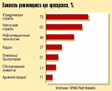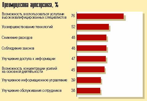 Конкурентные преимущества, а не просто экономия расходов - вот чего хотят добиться компании, переводящие свои бизнес-процессы под аутсорсинг. Таков главный вывод исследования по аутсорсингу бизнес-процессов, проведенного в 1997 г. компанией KPMG Peat Marwick. В опросе участвовали 189 руководителей высшего звена, представлявших компании с численностью сотрудников, превышающей 1000 человек. 164 руководителя (87% всех респондентов) сказали, что в настоящее время их компании применяют аутсорсинг бизнес-процессов.