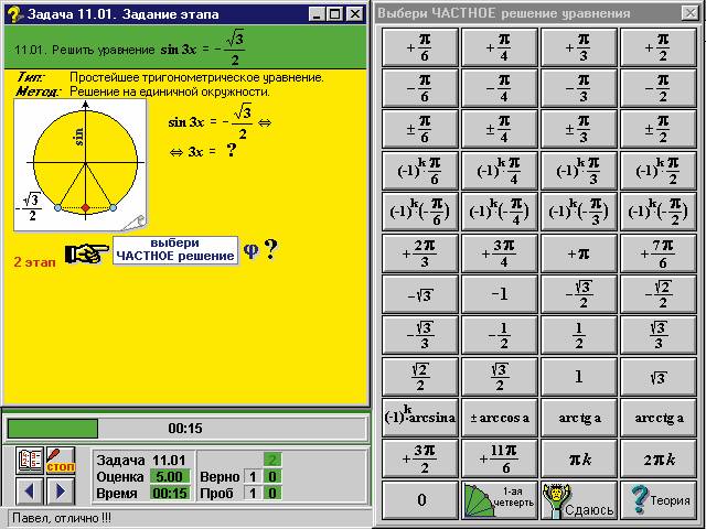 Справедливости ради надо отметить, что есть возможность (ценой одной попытки) получить правильный ответ на текущий вопрос, но в чем польза такого “дарового” ответа - непонятно. Можно заглянуть и в “теорию” (а точнее, в режим, где о каждой кнопке рассказано подробнее и приведены ссылки на соответствующие теоремы), но секундомер в этом случае не останавливается и за каждую минуту изучения материала засчитывается один “промах”.