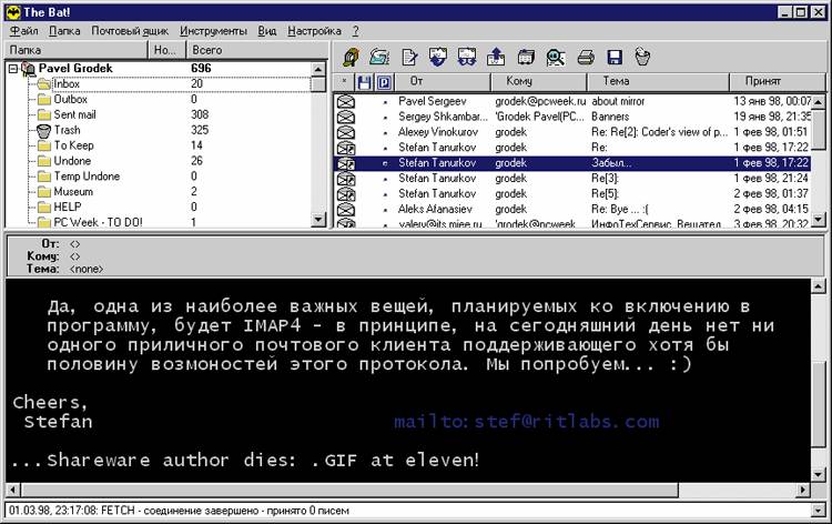 Увы, в один далеко не прекрасный день Communicator (точнее, его компонент под названием Messenger) отказался принимать очередную порцию почты, аварийно завершаясь на каком-то не понравившемся ему сообщении. Да и недостаток функций в нем к тому времени мне уже изрядно надоел. И решил я сменить почтовую программу. Знакомые порекомендовали обратить внимание не на знаменитые Eudora и Pegasus, а на российскую условно-бесплатную разработку молдавской фирмы RitLabs под названием The Bat!, что в переводе означает “летучая мышь”.