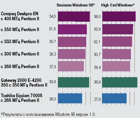 При испытаниях по эталонной программе Business Winstone 98 на скорость выполнения Windows-приложений замена 300 МГц Pentium II на процессор с тактовой частотой 400 МГц привела к возрастанию производительности на 17%. Тот же 400 МГц Pentium II в сравнении с 333 МГц Pentium II дает более скромный выигрыш - 11%.