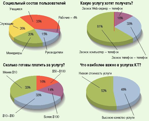 Поистине пророческий дар предвидения проявили компании ESSL Technologies (она предсказывает, что в 2006 г. Интернет-телефония составит 36% всех международных и междугородных звонков) и MCI (она считает, что в 2010 г. половина всех телефонных звонков будет осуществляться через Интернет). Как-то очень это напоминает “планов громадье”...
