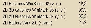 Тестирование проводилось по методике Zilf-Davis Labs. На блокнотный ПК была установлена Windows 95 OSR2.5 Eng, файловая система FAT32. Режимы дисплея: 1024x768 точек при 65 тыс. цветов - в тестах WinStone 98 и BatteryMark 2.0; 640x480 точек при 65 тыс. цветов - в тестах 3D Graphics WinMark 97 и 99. Шрифт - Small Font.
