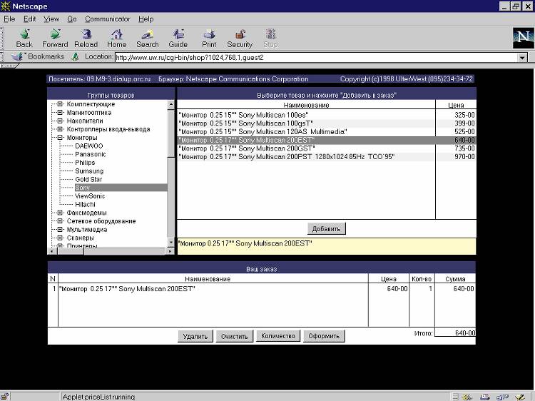 В более новой версии магазина, демонстрировавшейся на выставке, можно было производить поиск нужных товаров в каталоге. В той версии, которая на момент подготовки данной публикации имелась на узле “Альтер-Вест” (www.uw.ru), эта возможность отсутствовала.