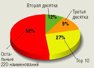 Как видите, три десятка программных продуктов (примерно из 250 наименований домашних программ, продаваемых фирмой “1С”) обеспечивают почти половину денежных поступлений.