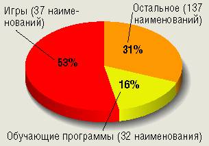 Интересное соотношение сложилось между играми, обучающими программами и остальными мультимедиа-дисками (разделение между вторыми и третьими, конечно, довольно условное; см. диаграмму “Игры - самый популярный товар”).