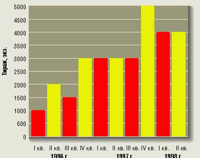 Интересно взглянуть на график “Средние тиражи мультимедиа-дисков”. Здесь основной вклад дают тиражи “хитов”, объемы же продаж остальных мультимедиа-дисков на их фоне уменьшаются. Если раньше можно было продать 3000 дисков практически любого наименования, то сейчас минимальный тираж приблизился к 1000 экземпляров.