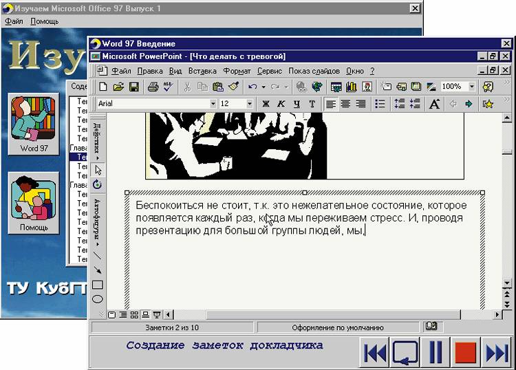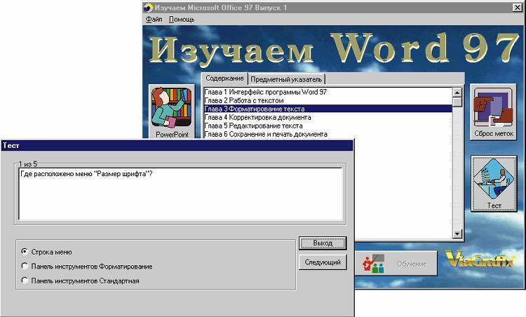 Увы, такое счастье не всем доступно: подавляющее большинство девушек-секретарш, да и не только их, похоже, навеки обречены общаться со все новыми и новыми версиями продуктов Microsoft. Им на помощь пришли Кубанский технический университет и фирма ViaGraphics, разработавшие отличный обучающий диск под названием “Изучаем Microsoft Office 97. Выпуск 1”.