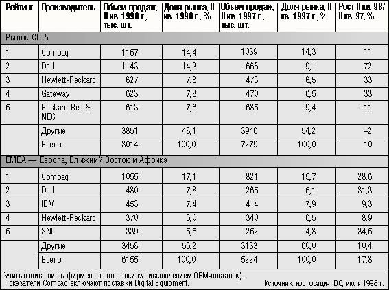 Compaq продолжает лидировать на мировом и региональных рынках. Следует обратить внимание, что приведенные здесь данные включают и поставки DEC (в том числе и по прошлому году). Сравнение этой информации с прошлогодней показывает, что в сегменте ПК прибавка от DEC ощущается весьма незначительно - для рынка США она составила 72 тыс. компьютеров за квартал, т. е. 7% от общего объема Compaq.