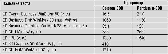 Оценка производительности системного блока проводилась в среде ОС Windows 95 OSR2.5. Разрешение 1024x768, 65 тыс. цветов, частота кадровой развертки 75 Гц, размер шрифта “small font”, файловая система FAT32. Тестирование проводилось с 17-дюймовым монитором производства компании Samsung. Применялись тесты Ziff-Davis Labs- пользовательский тест WinStone 98, синтетические универсальные тесты оценки производительности подсистем ПК WinBench 97 и 98 (подтесты CPU32, FPU, Business Disk и Business Graphics Winmark 98, CD-ROM Winmark 97, подтесты мультимедиа), а также тесты оценки производительности трехмерной графики 3D WinBench 98. В большинстве подтестов ПК показал результаты (см. таблицу), близкие к тем, что имеют аналогичные ПК, испытанные в Ziff-Davis Labs (см. www.zdnet.ru), а также хорошие результаты в тесте 3D Winbench 98 и мультимедиа-тестах. Для сравнения в таблице приведена производительность этого же ПК с процессором Pentium II-300; частота системной шины в обоих случаях была 66 МГц, коэффициент умножения частоты системной шины- 4,5. Из таблицы можно видеть, что отсутствие кэш-памяти у процессора Celeron определенно влияет на его производительность при работе даже с офисными приложениями (однако не настолько, чтобы считать приобретение ПК на его базе экономически невыгодным), а в подтесте FPU (оценивается производительность арифметики с плавающей точкой) разницу можно считать незначительной. При необходимости ПК можно модернизировать с помощью “обычного” процессора Pentium II, однако надо иметь в виду, что крепежные рамки для процессоров Pentium II и Celeron конструктивно отличаются и при замене процессоров необходимо поменять и рамки (входящая в комплект поставки системной платы рамка предназначается для процессора Celeron и для Pentium II не подходит).