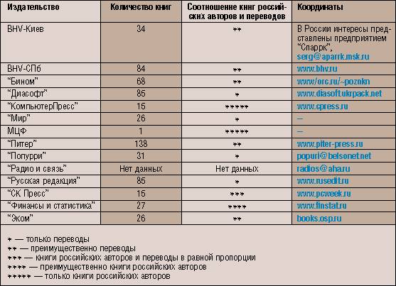 Торговать профессиональной литературой или вести подбор нужной литературы лучше всего по Интернету. Но возможностей для этого пока мало. Отчасти решают эту проблему сетевые магазины “Кнорус” (www.knorus.ru), “Книги России” (www.books.ru) и новый новосибирский магазин “Top-книга” (top-kniga.ru). Поэтому для того, чтобы не утонуть в книжном море, надо осваивать приемы комплексного плавания и прежде всего ближе знакомиться с издательствами.