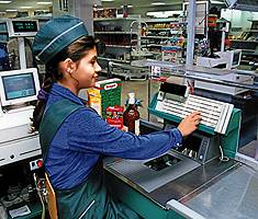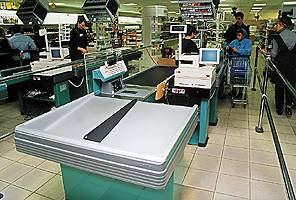 Войдя в стеклянные двери этого нового, с аккуратной вывеской магазина, прямиком попадаешь из московского Строгина в Западную Европу: разноцветные стеллажи, чистые, хорошо освещенные прилавки, современное оборудование и полное отсутствие очередей. Шеренга специальных столов, на которых установлены электронные кассовые аппараты (POS-терминалы), непривычно открыта - кассиры отделены от покупателей лишь небольшой клавиатурой и легкой металлической стойкой с дисплеем. При этом девушки сидят лицом к покупателю, а не к торговому залу, ведь так гораздо удобнее и быстрее сканировать штрих-коды на товарах и рассчитываться. Несколько ловких, уверенных движений - и вот уже все содержимое тележки перекочевало на стол, а кассир отсчитывает сдачу. И не надо искать ценник, налепленный на упаковку в самом неожиданном месте, не надо, напрягая глаза, пытаться разобрать едва видные цифры, не надо выбивать цену, считая многочисленные нули, - достаточно лишь провести товаром над столом, в который встроен сканер, и кассовый аппарат сработает сам, а рука уже подносит новый предмет из тележки.