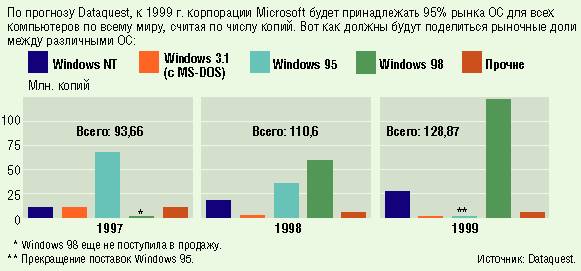 По прогнозу Dataquest, к 1999 г. корпорации Microsoft будет принадлежать 95% рынка ОС для всех компьютеров по всему миру (считая по числу копий).