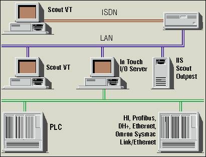 В FactorySuite просмотр данных реального времени через Internet осуществляется с помощью набора компонентов Scout (рис. 2). Scout состоит из двух базовых частей: сервера Scout Outpost и клиента Scout VT.