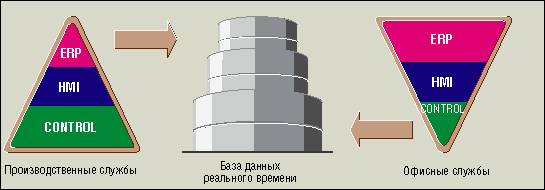 Все компоненты FactorySuite интегрируются с Microsoft SQL Server, Windows NT Server, Systems Management Server, SNA Server и Mail Server. Это расширяет возможности персонала, объединяя в масштабе предприятия производственные структуры с управленческими. Доступ к базе данных реального времени и традиционным реляционным базам данных, использование ActiveX-объектов и API-функций возможны как с уровня управления (Control), обеспечивающего сбор данных от различных датчиков через устройства сопряжения, так и с уровней визуализации (HMI, Human Machine Interface) и планирования (ERP, Enterprise Resources Planning systems) (рис. 3). Информация на производстве поступает и “сверху”, и “снизу”. “Сверху” формируется информация, отвечающая за работу предприятия в целом, осуществляется планирование производства.