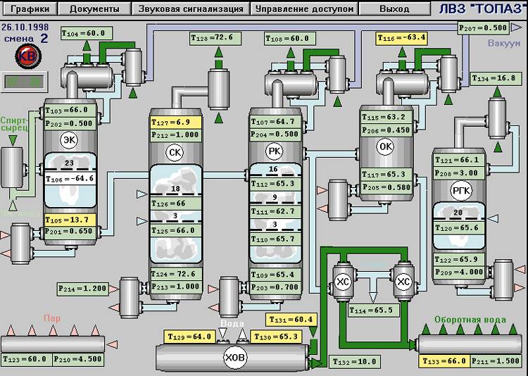 Информационно-измерительная система установки ректификации. Система предназначена для автоматизации контроля параметров работы технологического оборудования для производства водки и спирта, управления исполнительными механизмами в реальном масштабе времени, включения аварийной сигнализации, отображения технологических параметров и ведения архива. Система внедрена на ликероводочном заводе “Топаз” (г. Пушкино) специалистами компаний “БИАТ” и RTSoft.