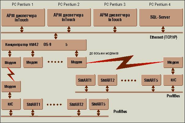 АРМы диспетчеров работают под управлением приложений InTouch и получают технологические данные от концентратора 5 с помощью пакета PCLink. Для обеспечения связи АРМов диспетчеров с SQL-сервером используются специальные средства в InTouch, поддерживающие SQL-запросы.