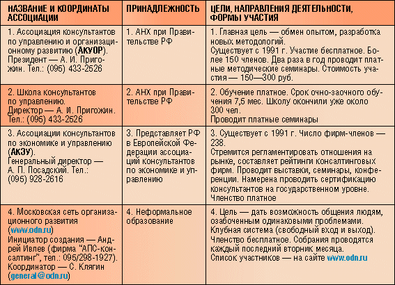 Две упомянутые в таблице ассоциации появились на свет примерно в одно и то же время, но принципы их образования и преследуемые цели, на мой взгляд, сильно различаются. АКЭУ изначально позиционировала себя как некое элитное объединение, которому по плечу крупные заказы по консалтингу (государственного уровня и по зарубежным грантам). Одна из ее главных целей - создать сертификационный центр, выдающий лицензии на консалтинговую деятельность работающим в России фирмам.