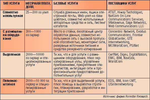 У тех же компаний, которые не могут затратить 2 млн. долл. на создание ВЦ с высокоскоростными каналами передачи данных, программными средствами управления и технологиями виртуальных СУБД, есть другой выход: обратиться к поставщикам услуг, например к NaviSite или USinternetworking (см. таблицу во врезке “Услуги центров...”), которые с удовольствием помогут им.