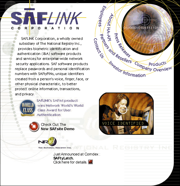 Корпорация Saflink (прежнее название National Registry) предлагает систему SaftyLatch - совместимый с операционными системами Windows 95/98 продукт, использующий биометрические средства идентификации и аутентификации для предотвращения случайного или намеренного доступа к хранимой на магнитном диске конфиденциальной информации.