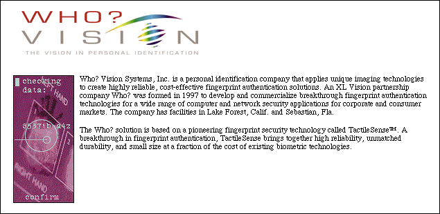 Фирма Who? Vision Systems разрабатывает и распространяет биометрические технологии сканирования отпечатков пальцев. Выпускаемое ею семейство продуктов TactileSense повышает степень защиты корпоративных сетей; при этом отпадает необходимость в применении обычных паролей.