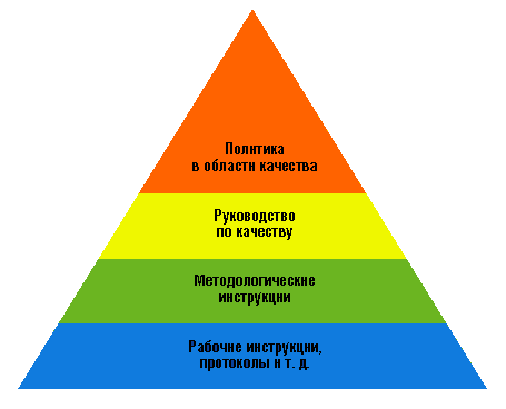 Общая структура документации на систему качества оговорена стандартами серии ISO 9000 (9000-1, 9000-2, 9001, 10013, 9004-5) и обычно представляется в виде так называемой пирамиды качества (рис. 1).
