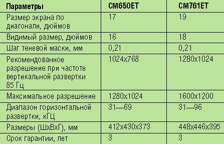 Обе модели соответствуют недавно введенному стандарту TCO’99, что обеспечивает пользователю безопасные и комфортные условия работы, а также способствует минимизации вредного влияния мониторов на окружающую среду. Все устройства имеют легкое в управлении экранное меню на пяти языках и совместимы с рабочими станциями Apple-Macintosh и Sun Microsystems. Ориентировочная розничная цена модели CM650ET составляет 399 долл., а модели CM761ET - 849 долл.