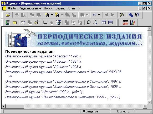 Если иностранный язык интересно изучать методом погружения, то юридическую лексику таким способом осваивать не хочется. Лучше обратиться к специализированным журналам, которые на конкретных примерах растолкуют, как многочисленные законы преломляются в нашей жизни. Тем более что появилось новое ежеквартальное компьютерное издание, вмещающее все выпуски бумажных журналов “Адвокат” (выходит с 1996 г.) и “Законодательство и экономика” (с 1993 г.).