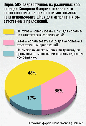 Преимущества Linux очевидны - никакой платы за лицензии, невысокие системные требования, позволяющие работать на более старом и недорогом оборудовании, открытый доступ к исходным текстам. Тем не менее во многих уголках мира ИТ внедрение этой бесплатной разновидности ОС Unix по-прежнему рассматривается как игра втемную. Несмотря на недавнюю серию заявлений о поддержке Linux, сделанных такими крупными компаниями, как Corel, Oracle, IBM, Hewlett-Packard, Informix и SAP, большинство главных ИТ-директоров продолжают считать, что недостаток профессиональной поддержки и офисных приложений для настольных машин ограничивают сферу применения этой ОС Web-серверами и серверами электронной почты. На их взгляд, должно пройти еще некоторое время, прежде чем можно будет достаточно серьезно говорить о стимулировании к переходу на новую платформу разработчиков, знакомых с коммерческими версиями Unix и Windows NT, и конечных пользователей, вкусивших прелестей офисных приложений корпорации Microsoft.