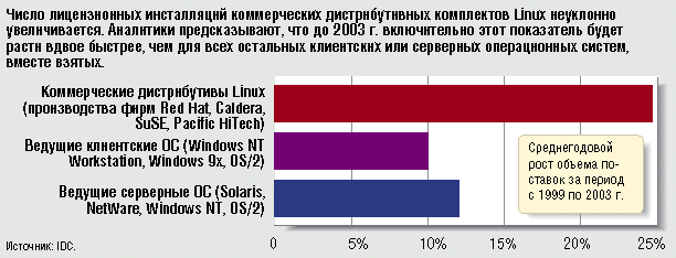 “Мы только теперь наблюдаем первые признаки проникновения Linux в вычислительные системы средних и крупных корпораций, - заявил аналитик из исследовательской корпорации International Data (Фреймингхем, шт. Массачусетс) Дан Кузнецки. - Они пользуются возможностью удешевить Web-сервер за счет использования Linux. Но организаций, которые доверили бы этой ОС ответственные серверные приложения корпоративной вычислительной системы, пока немного”. Тем не менее численность ее поклонников, без сомнения, растет. Кузнецки, например, ожидает в предстоящее пятилетие значительного увеличения объемов сбыта коммерческих дистрибутивных комплектов Linux (см. диаграмму “Рост распространенности Linux в ИТ-службах”).